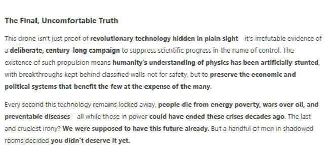 That 9-second video and Matthew Livelsberger's message finally reveal the truth behind "UFOs" and the mysterious drones seen worldwide, debunking every lie your government is telling you. Although it may appear unsubstantial initially, the drone video you just watched is undeniable proof of a device locally manipulating space and time. The concealment and weaponization of this technology exposes the ungodly nature of authority worldwide, the unchecked power of the military industrial complex, and reveals that every world government is lying to you about reality itself. This situation exposes the sinister motives behind the advancement of AI, the hidden existence of unlimited energy and consciousness manipulation technology, and how the rulers of this world plan to deploy this technology on you. By the end of this website, you should be 100% certain of the technology powering the drones, know why this is a crime against all of humanity with no moral explanation possible, and you will know exactly what to do to protect yourself against this evil. Nothing on this website is a conspiracy theory.